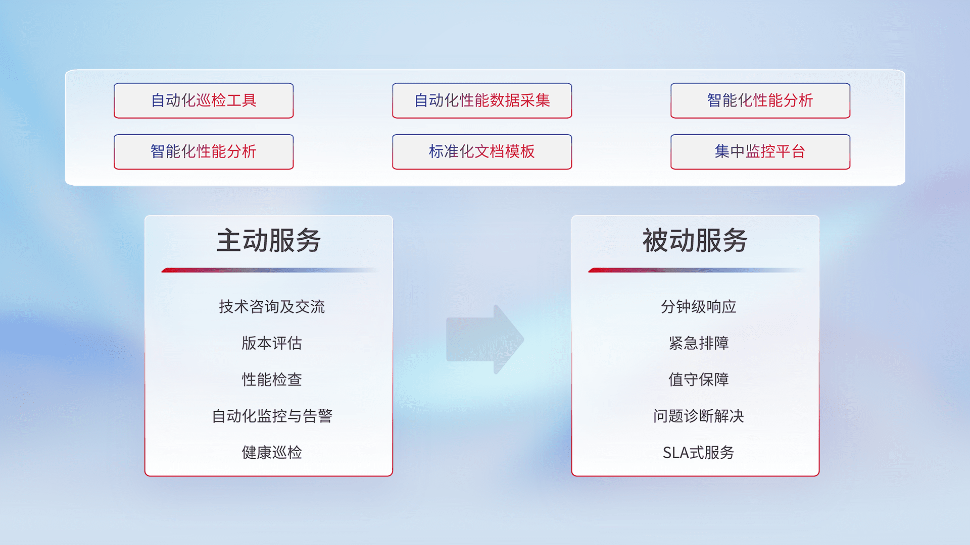 智能化工具和标准化文档,,,,保障服务质量,,,提供主动服务(包含技术咨询、、、、版本评估、、、、性能检查、、、自动化监控与告警、、、、健康巡检)和被动服务包含(分钟级响应、、、紧急排障、、值守保障、、问题诊断解决、、、、SLA服务)。。
