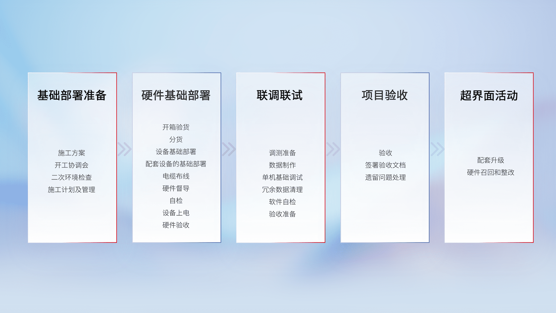 从基础部署准备、、、、硬件基础部署、、、联调联试、、、、项目验收、、越界面活动的全过程可追溯,,保证施工质量和进度。。。